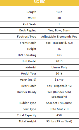The name of this kayak, Big Rig, sums up exactly what it is intended to do and for whom it was intended to do it for - big stability for the many anglers that deserve a model to help them feel comfortable in a smaller watercraft, and even allow them to stand and fish from one! If this kayak was much wider we might have to call it a boat, but our design team kept it at just the right specs to allowing the Big Rig to maintain the performance of a kayak with the stability of a boat. They also crafted the hull for reliable, efficient performance in most kayak fishing situations - lakes, ponds, rivers, inshore saltwater bays or marshes - so no matter where you go the Big Rig is ready to make you feel comfortable there!